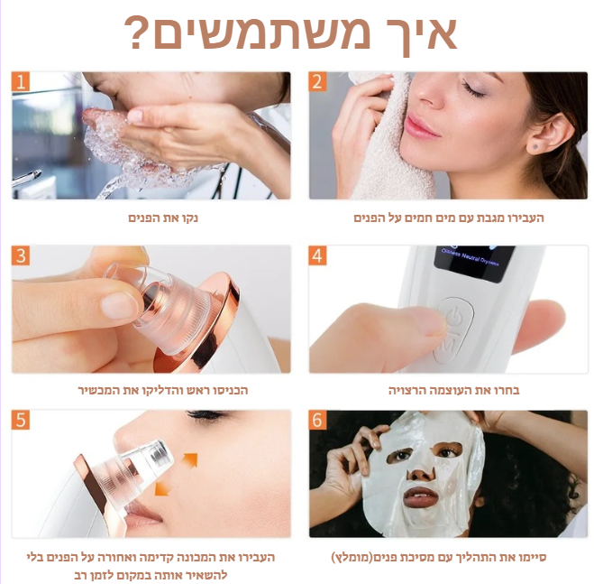 פשוט בוחרים את אחד מ־6 הראשים המתחלפים בהתאם לאזור הפנים (אף, סנטר, לחיים ועוד), מדליקים את המכשיר, ומעבירים בעדינות על העור בתנועות איטיות.
